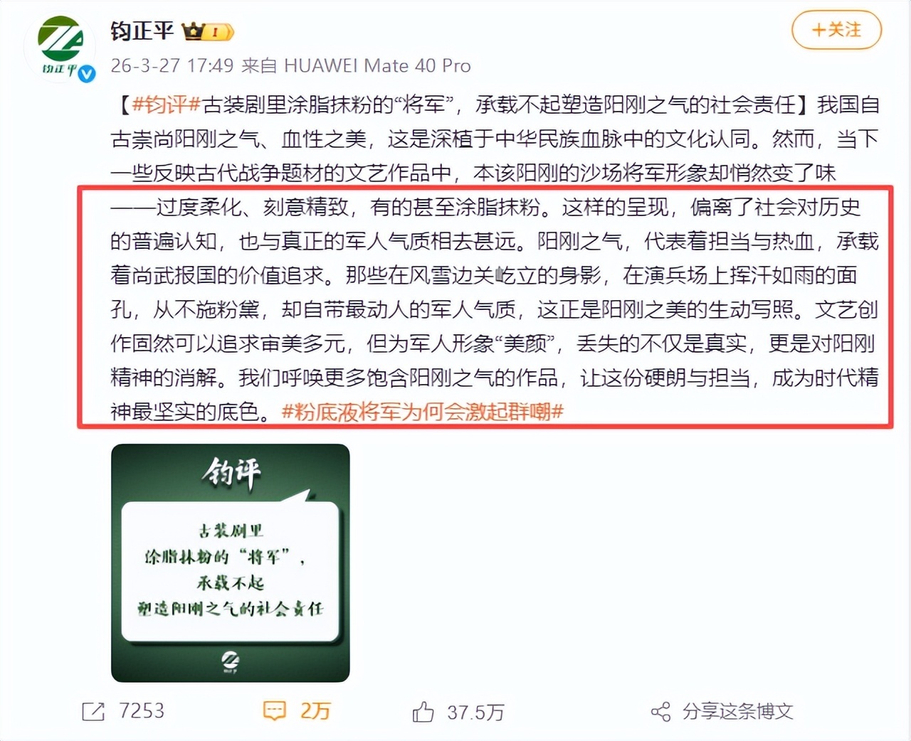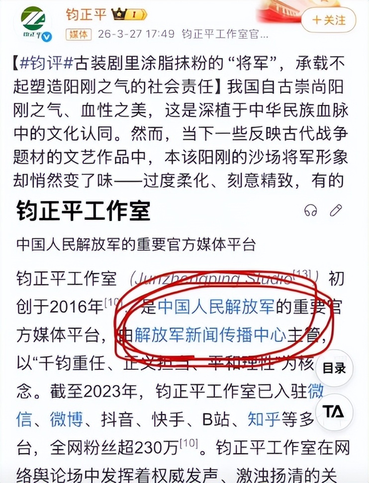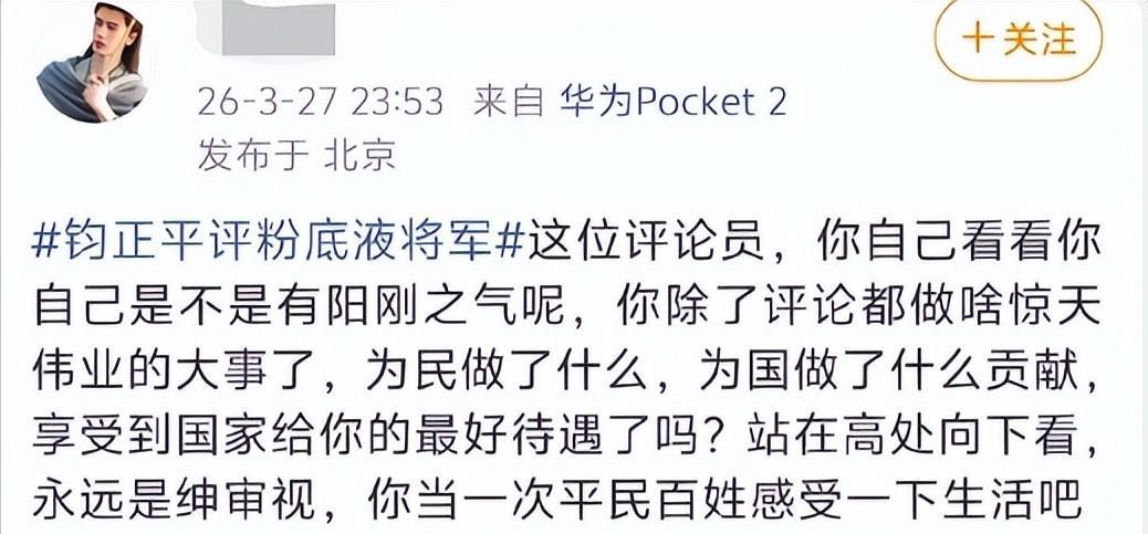 就在网友讨论持续升温时,军方权威媒体账号钧正平正式发文,点评“粉底液将军”现象。