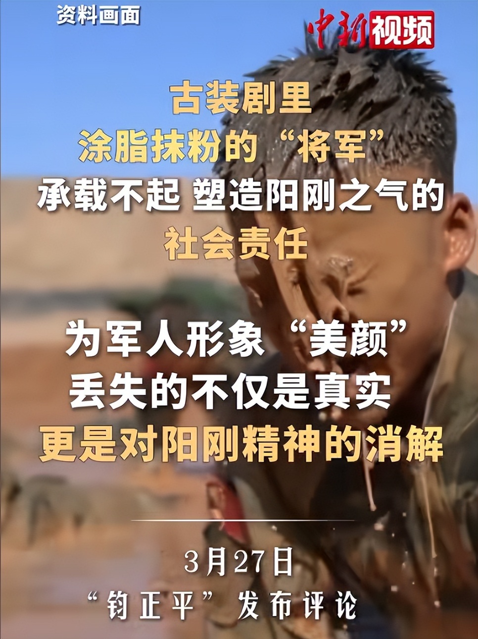 钧正平的文章大意明确指出,文艺作品应当塑造有血性、有阳刚之气的军人形象,不能过度柔化失真。
