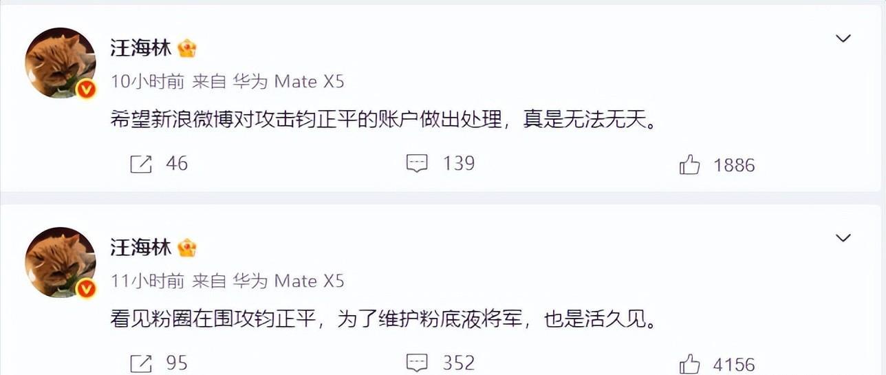 他直接用“无法无天”形容部分粉丝攻击军方账号的举动,很显然,再汪海林的眼中,这些粉丝的行为已经突破了文明底线。