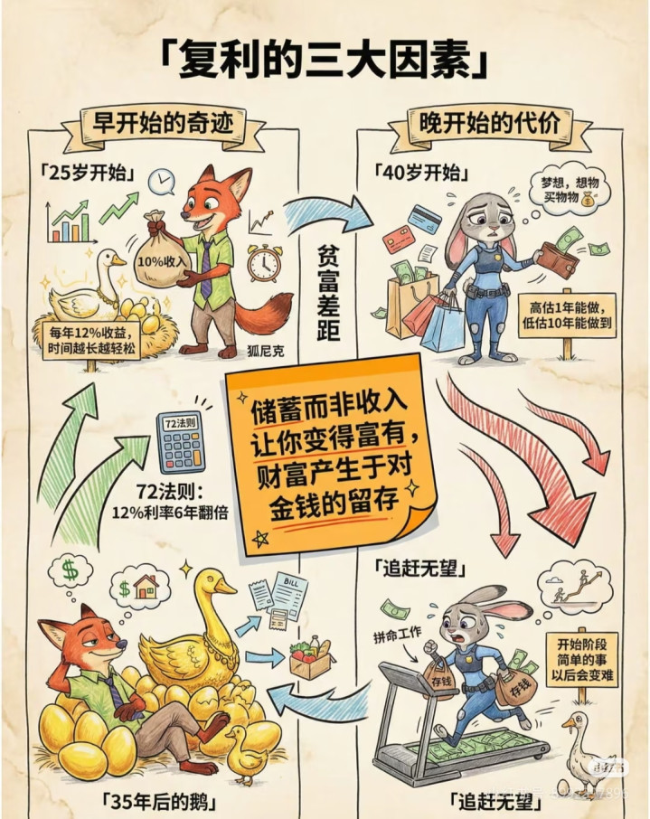 - 核心逻辑:时间是复利的朋友,越早开始,复利的威力越大,普通人的财富,都是靠时间滚出来的