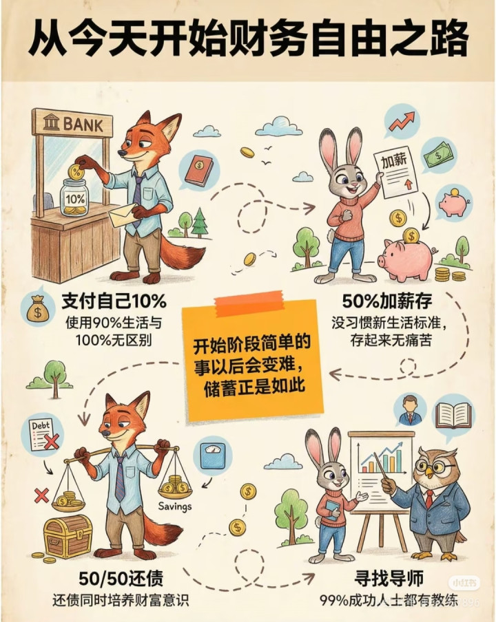 - 核心逻辑:还债的同时,绝不停止储蓄,用50%的钱还债,50%的钱储蓄,培养财富习惯
